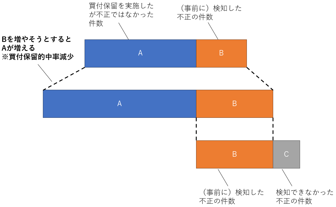 例えば、検知成功率を上げるためには、買付保留の数を増やす必要がありますが、(きれいに不正だけを検知することは基本ないので)母数が増えて買付保留的中率は下がります。