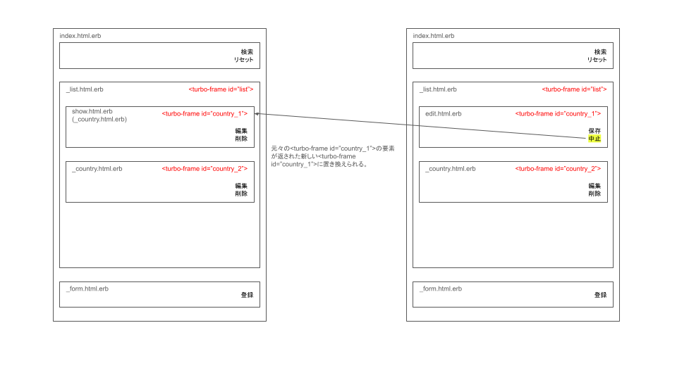# id属性がcountry_{@country.id}のturbo-frame要素をupdate後に置き換える