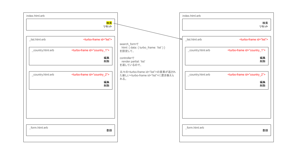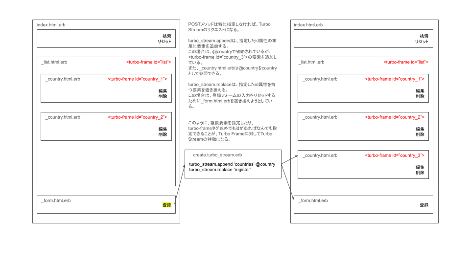 # id属性がcountriesの要素の末尾に_country.html.erbを追加 <%= turbo_stream.append 'countries', @country %> # 登録フォームを入力をリセット <%= turbo_stream.replace 'register' do %> <%= render 'form' %> <% end %>